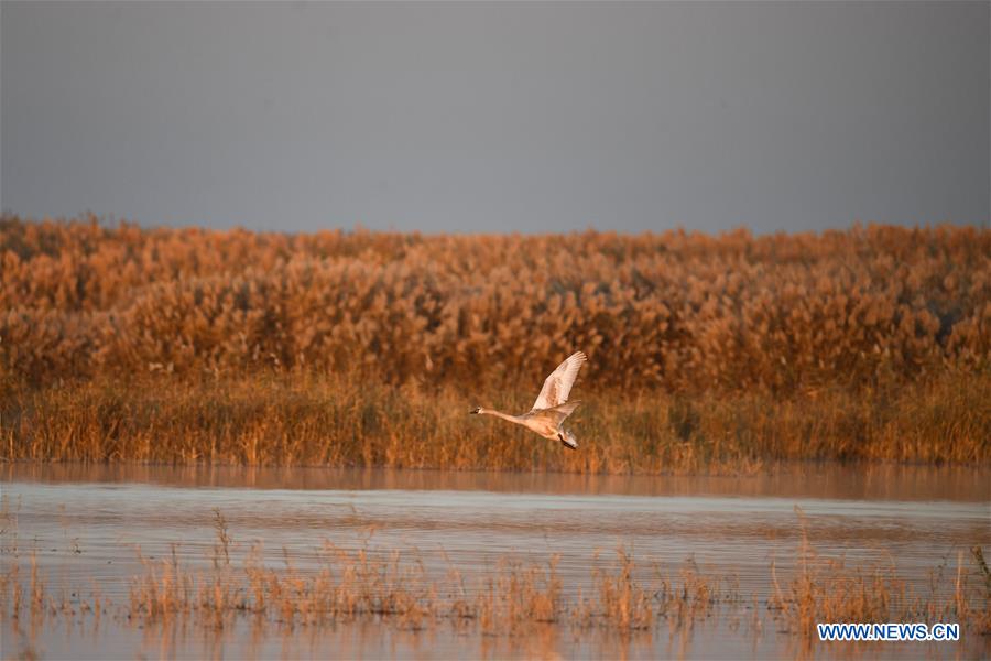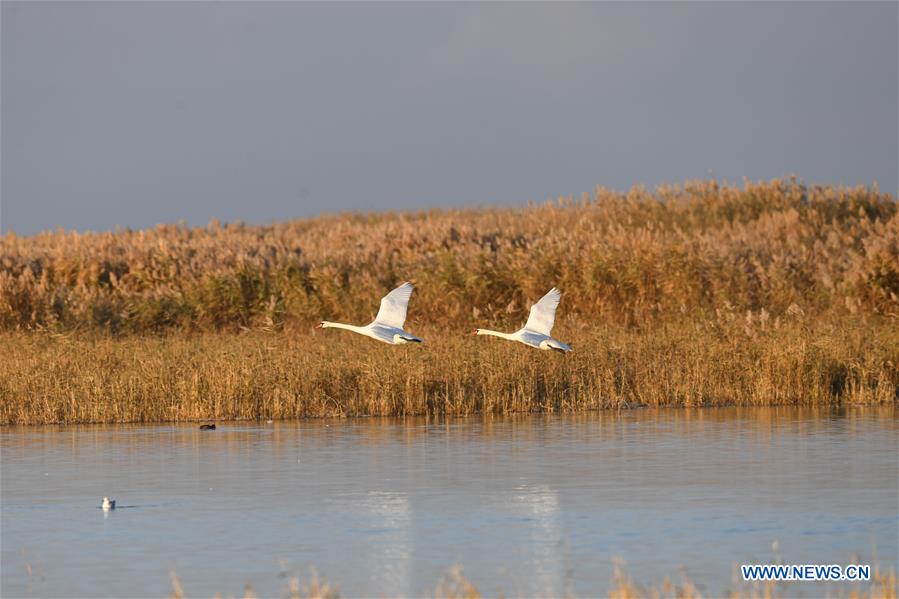 Photos prises le 25 octobre 2019 montrant des cygnes tuberculés nageant dans l'Ulansuhai Nur, un lac situé à Bayannur de la région autonome de Mongolie intérieure (nord de la Chine).