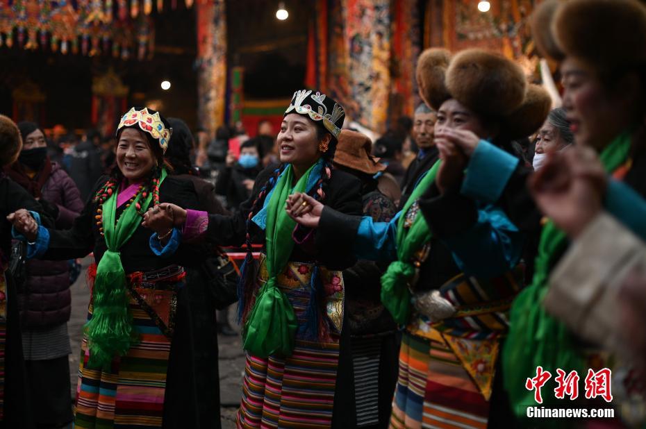 Des fidèles réunis autour du temple de Jokhang chantent une chanson de bons v?ux et dansent une danse traditionnelle devant une statue pour célébrer le ? festival de fées ?.