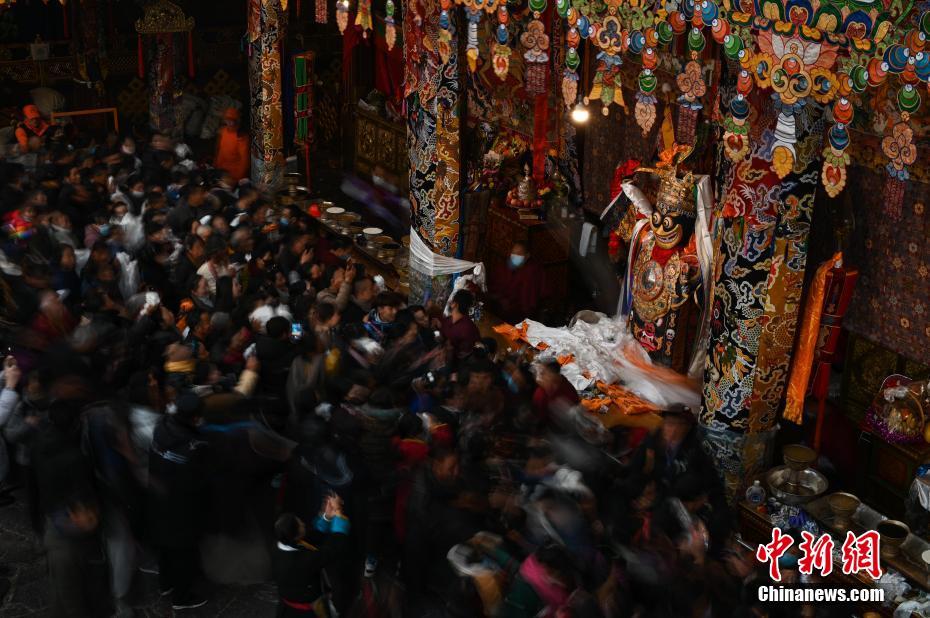 Des croyants chantant des chansons de bons v?ux dans le temple de Jokhang et dansent une danse traditionnelle devant une statue pour célébrer le ? festival de fées ?.