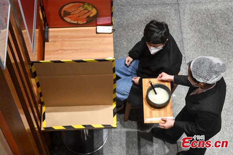 Des clients mangent des nouilles dans un restaurant à Lanzhou, capitale de la province du Gansu, le 19 février 2020. Pour freiner la propagation du coronavirus, les restaurants de nouilles de la ville ont été appelés à limiter le nombre de clients et à fournir des tables dispersées aux clients.