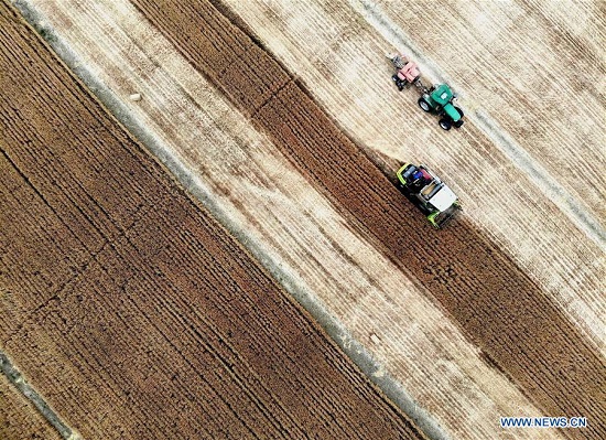 Récolte du blé dans les champs au village de Nanling du district de Shangshui, dans la province du Henan (centre de la Chine), le 29 mai 2020.