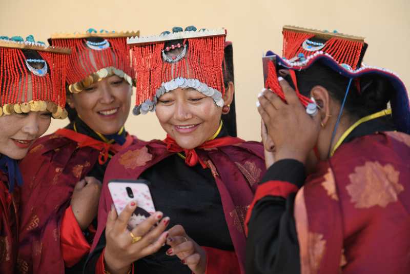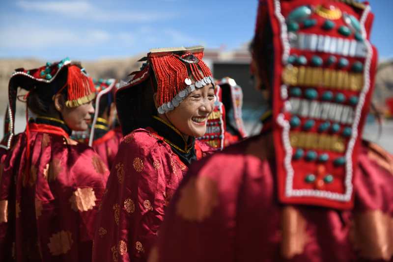 Les danseurs de la danse ? Xuan ? de la troupe d'art du district de Zanda triant leurs costumes.