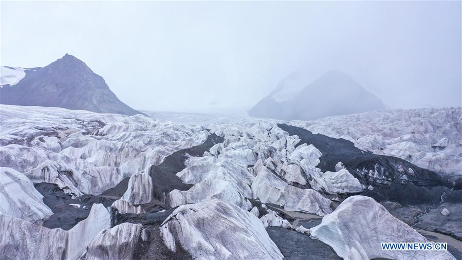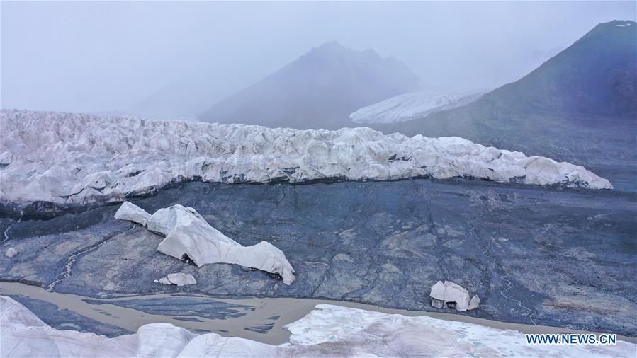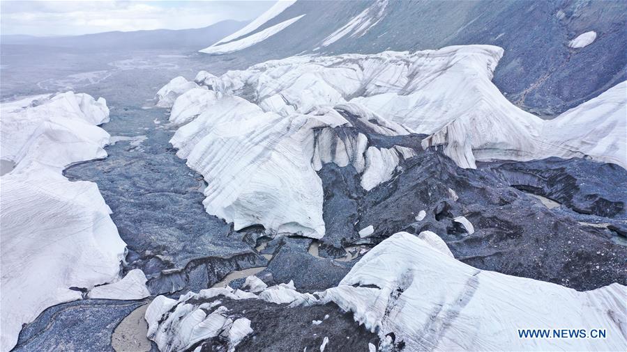 Photo aérienne d'un glacier, situé à la source du fleuve Yangtsé, de la préfecture autonome tibétaine de Yushu, dans la province chinoise du Qinghai (nord-ouest), le 15 ao?t 2020.