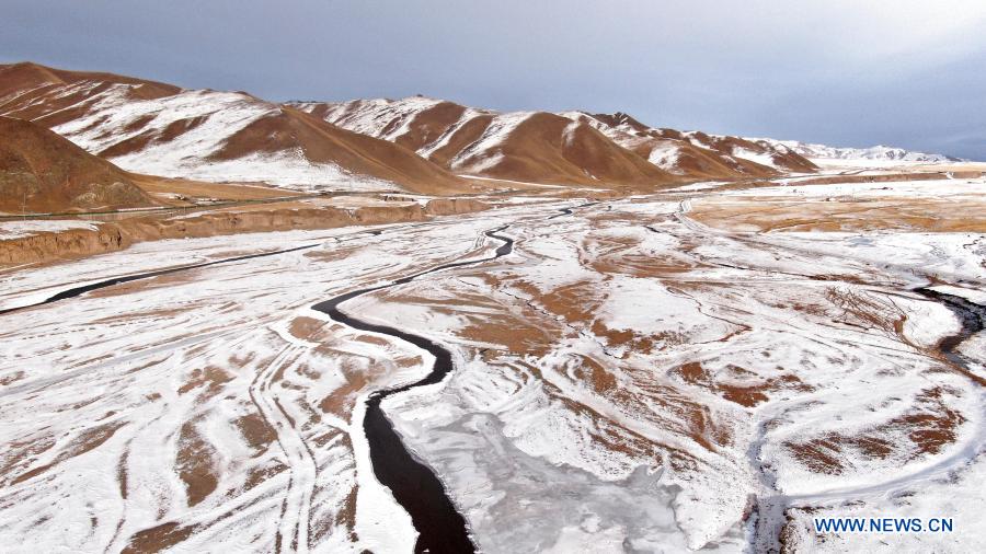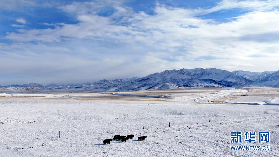 Photo aérienne prise le 6 décembre, montrant des yaks en train de marcher sur la prairie d'Arou, dans le xian de Qilian, dans la province du Qinghai (nord-ouest). Après des chutes de neige, la prairie d'Arou s'est retrouvée couverte d'un manteau blanc, présentant à la vue une image splendide. (Photos : Xinhua Zhang/Hongxiang)