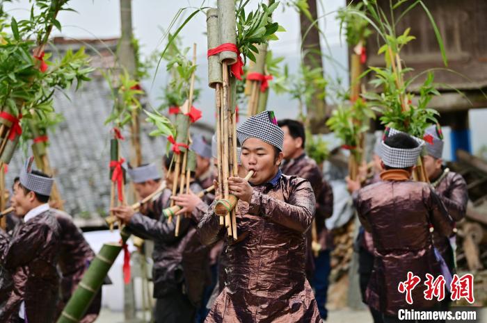 Le 15 décembre, des membres de l'ethnie Miao dansent et jouent du lusheng (un instrument à vent à anche) dans le village de Datang, situé dans la préfecture autonome Miao et Dong de Qiandongnan (province sud-ouest du Guizhou), afin de célébrer leur Nouvel An traditionnel. (Photos : Wu Dejun/Chinanews)