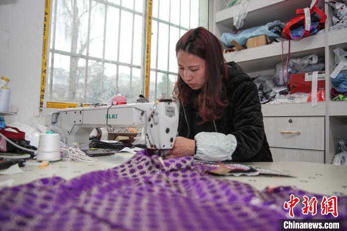 Une ouvrière travaille dans un atelier de fabrication de costumes traditionnels de l'ethnie Miao, au village de Gaojin, dans la province du Guizhou (sud-ouest), le 5 janvier 2021. A l'approche de la fête du Printemps, les artisans de la broderie de l'ethnie Miao travaillent chaque jour jusque tard pour satisfaire la demande accrue du marché des costumes traditionnels folkloriques. (Photos : Zhai Honglun/Chinanews)