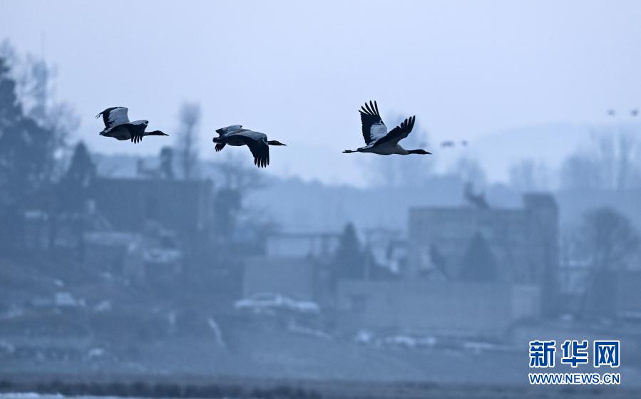 • Guizhou : des grues à cou noir s'amusent dans la réserve naturelle nationale de Caohai
