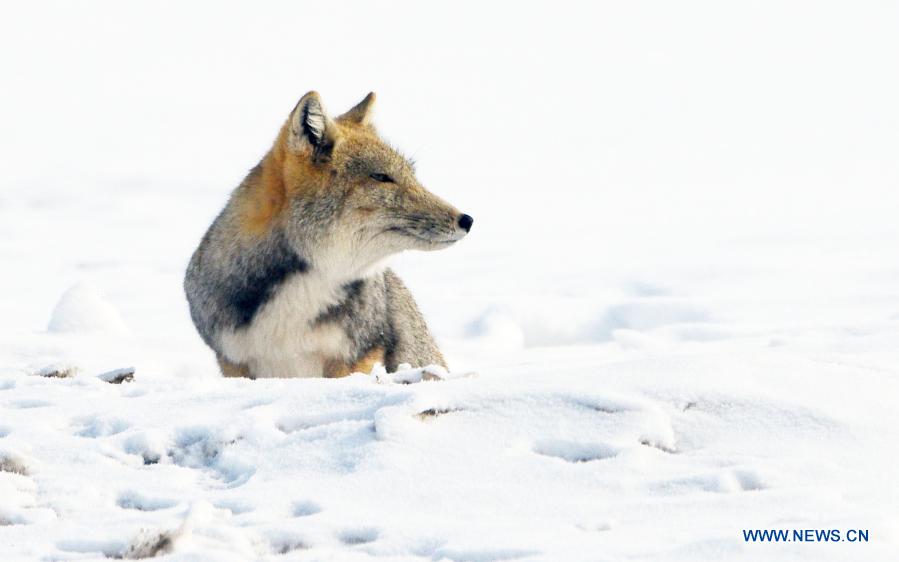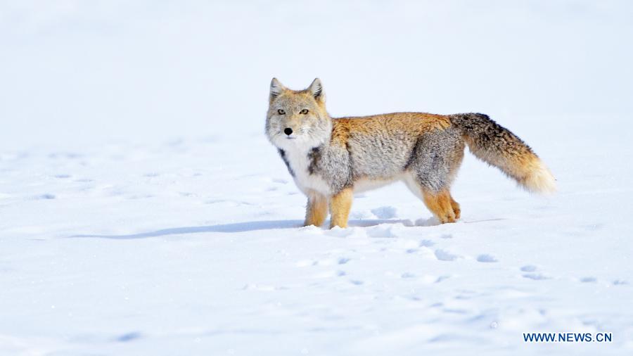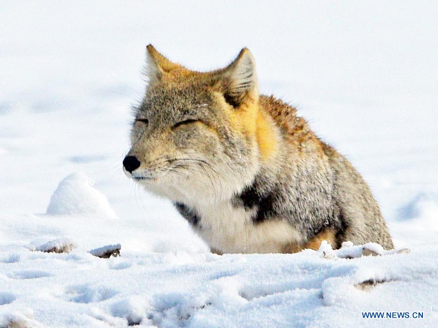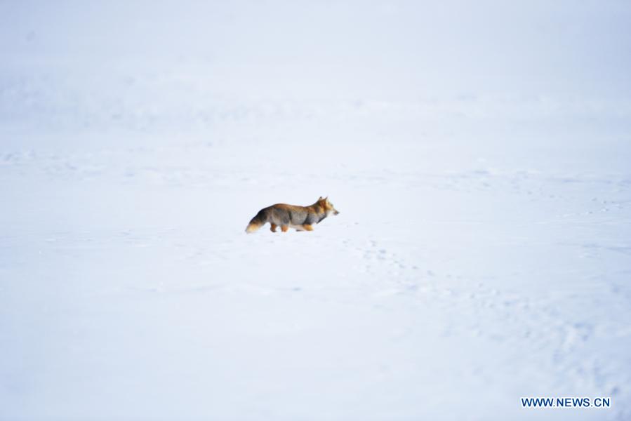 Un renard tibétain est photographié après une chute de neige dans le district autonome kazakh d'Aksay, à Jiuquan, dans la province chinoise du Gansu (nord-ouest), le 23 janvier 2021. (Photo : Gao Hongshan)