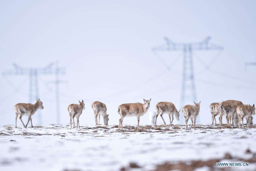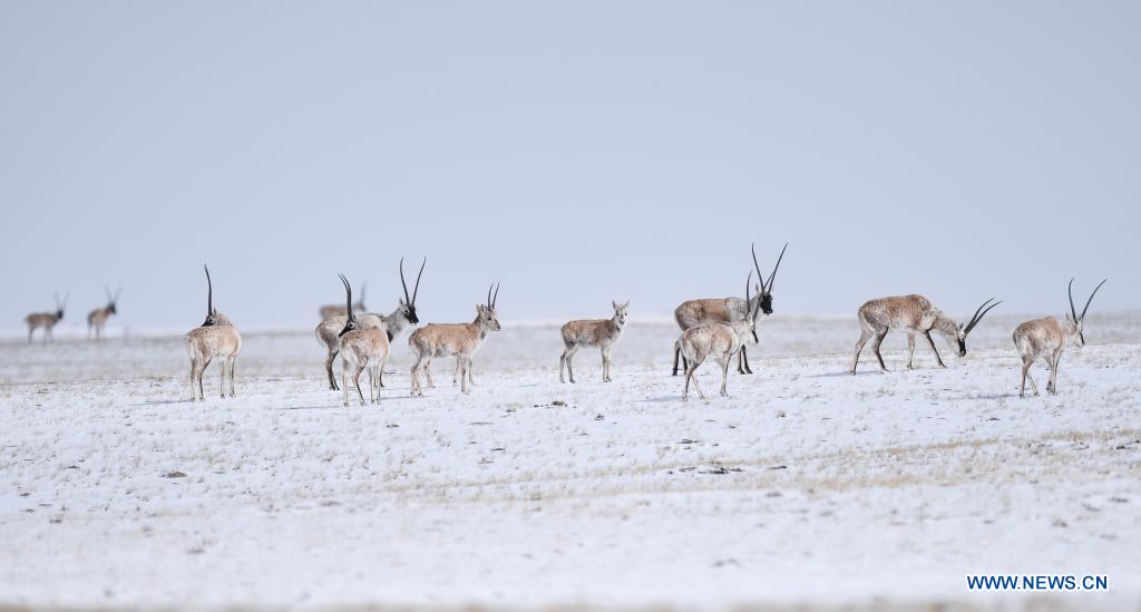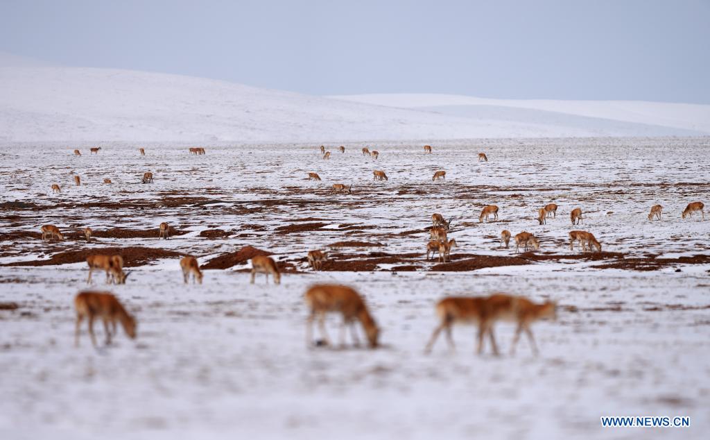 Un troupeau d'antilopes tibétaines se dirige vers le lac Zonag, dans la réserve naturelle nationale de Hoh Xil, dans la province du Qinghai (nord-ouest de la Chine), le 20 avril 2021. De nombreuses antilopes tibétaines ont afflué dans la zone de Wudaoliang durant de récentes chutes de neige à Hoh Xil, se préparant pour leur migration. Le lac Zonag à Hoh Xil est connu comme la "salle d'accouchement" de cette espèce. Chaque année, des antilopes tibétaines enceintes commencent en mai leur migration vers Hoh Xil pour accoucher, puis retournent dans leur habitat avec leur progéniture vers le mois d'ao?t. Les antilopes tibétaines vivent principalement dans la région autonome du Tibet, la province du Qinghai et la région autonome ou?goure du Xinjiang. L'espèce bénéficie d'une protection d'Etat de première classe en Chine. (Photo : Fei Maohua)