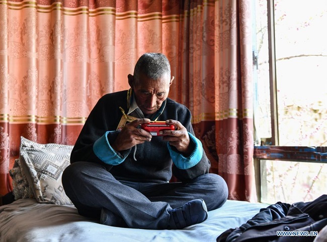 Lhapu écoute la radio chez lui, dans le village de Lin'a du comté de Dagze à Lhassa, capitale de la région autonome du Tibet (sud-ouest de la Chine), le 25 avril 2021.