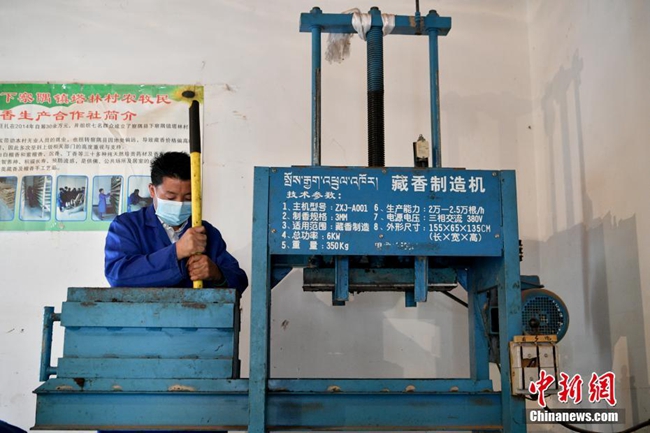 Le 22 juillet, un ouvrier mettant les matières premières de l'encens tibétain dans la machine de fabrication.