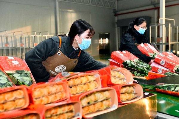 Des employées emballent des roses dans une base de plantation de roses dans le bourg de Zhaoxian du district de Juxian, dans la province chinoise du Shandong (est), le 17 décembre 2021. L'industrie de la rose a vu un développement rapide dans le bourg de Zhaoxian ces dernières années et aide les habitants locaux à augmenter leurs revenus. (Xinhua/Guo Xulei)