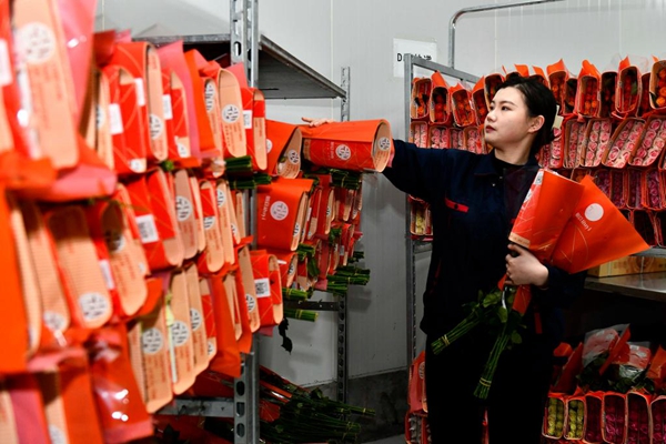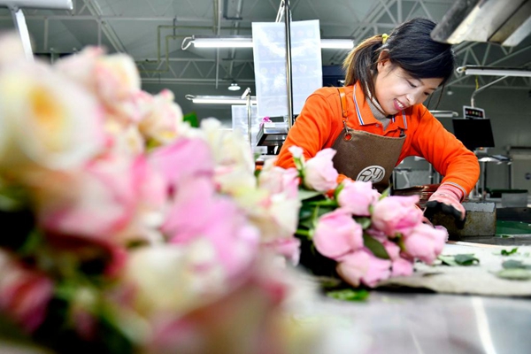 Une employée emballe des roses dans une base de plantation de roses dans le bourg de Zhaoxian du district de Juxian, dans la province chinoise du Shandong (est), le 17 décembre 2021. L'industrie de la rose a vu un développement rapide dans le bourg de Zhaoxian ces dernières années et aide les habitants locaux à augmenter leurs revenus. (Xinhua/Guo Xulei)