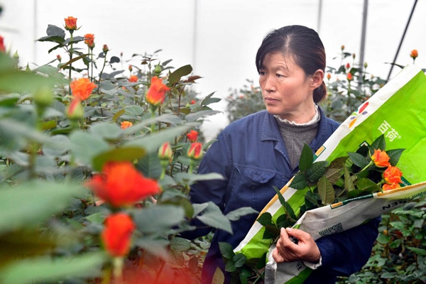 Une employée travaille dans une base de plantation de roses dans le bourg de Zhaoxian du district de Juxian, dans la province chinoise du Shandong (est), le 17 décembre 2021. L'industrie de la rose a vu un développement rapide dans le bourg de Zhaoxian ces dernières années et aide les habitants locaux à augmenter leurs revenus. (Xinhua/Guo Xulei)