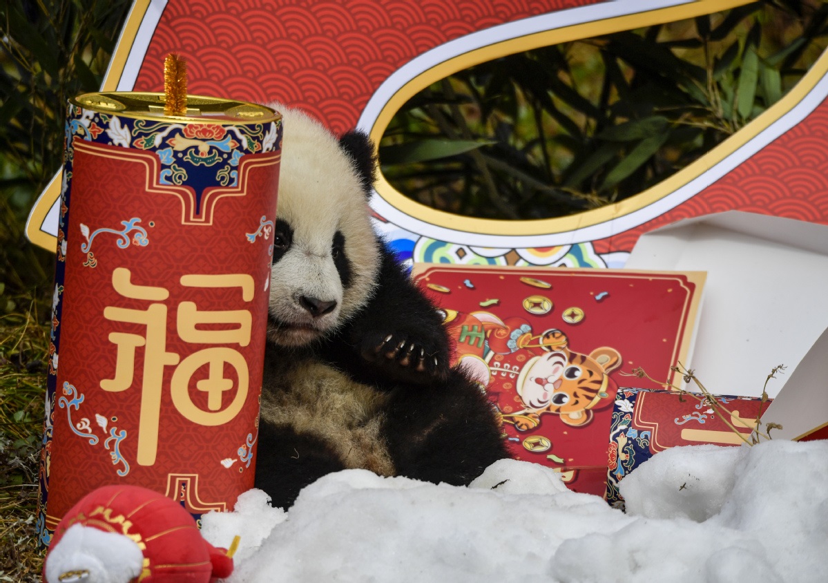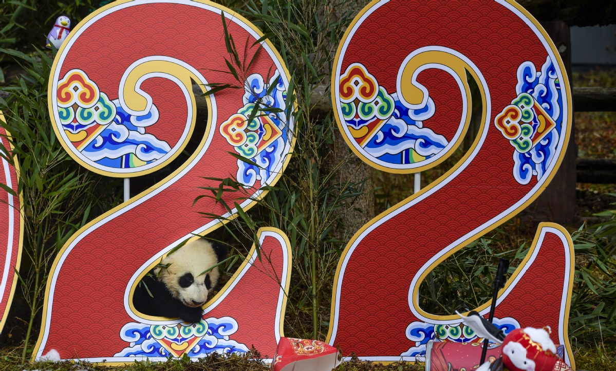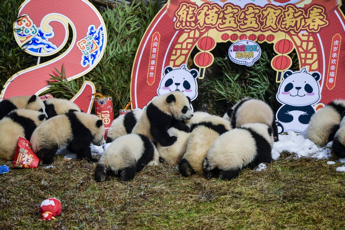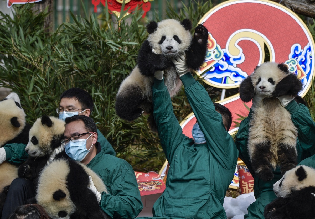 Vingt pandas géants nés en 2021 ont participé le 24 janvier à une cérémonie de la fête du Printemps à la base de Shenshuping du Centre de recherche et de conservation des pandas géants de Chine, dans la province du Sichuan (sud-ouest de la Chine). Un total de 27 petits pandas géants sont nés au centre en 2021. (He Haiyang / chinadaily.com.cn)
