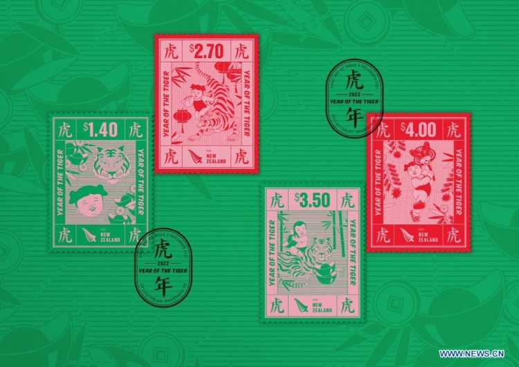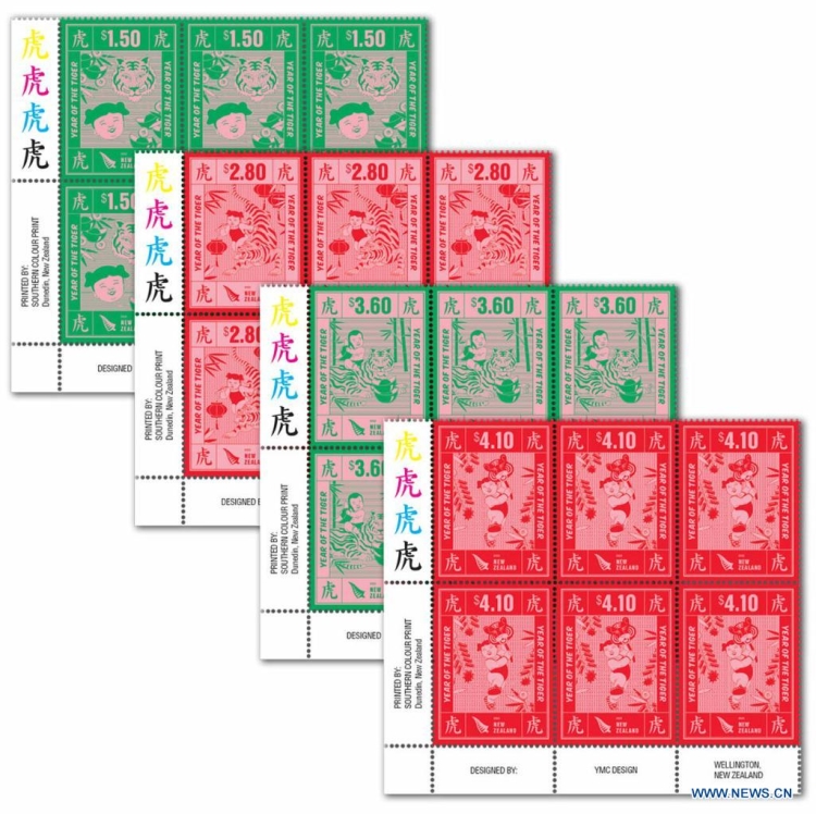 La poste néo-zélandaise a émis récemment des timbres pour l'année chinoise du tigre pour célébrer le prochain Nouvel An chinois. C'est la 26e année consécutive que la Nouvelle-Zélande émet des timbres du zodiaque chinois. (Poste néo-zélandaise/Xinhua)