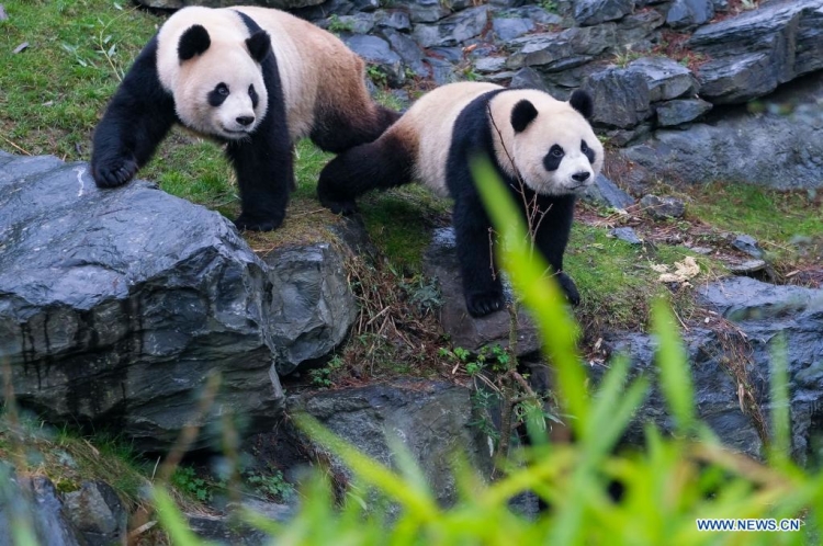 Photo prise le 26 janvier 2022 montrant les pandas géants Hao Hao (à gauche) et Bao Mei au parc animalier Pairi Daiza à Brugelette, en Belgique. (Xinhua/Zhang Cheng)
