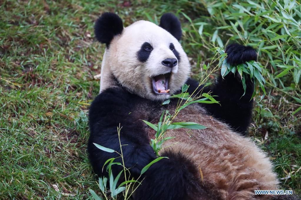 Photo prise le 26 janvier 2022 montrant le panda géant Hao Hao au parc animalier Pairi Daiza à Brugelette, en Belgique. (Xinhua/Zhang Cheng)