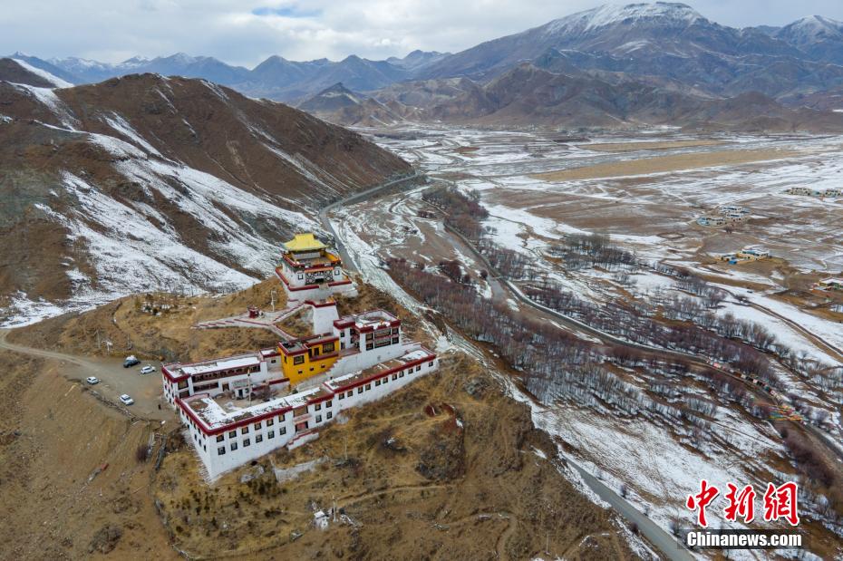 Une photographie aérienne prise le 23 février du paysage après la chute de neige au temple Chujie dans le district de Lhundrup, au Tibet.