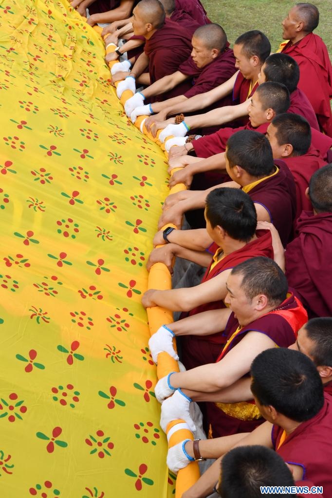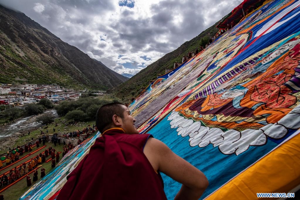Des moines participent à un rituel annuel d'exposition de tanka de Bouddha au monastère de Tsurphu, dans la région autonome du Tibet (sud-ouest de la Chine), le 11 juin 2022. (Photo : Jiang Fan)