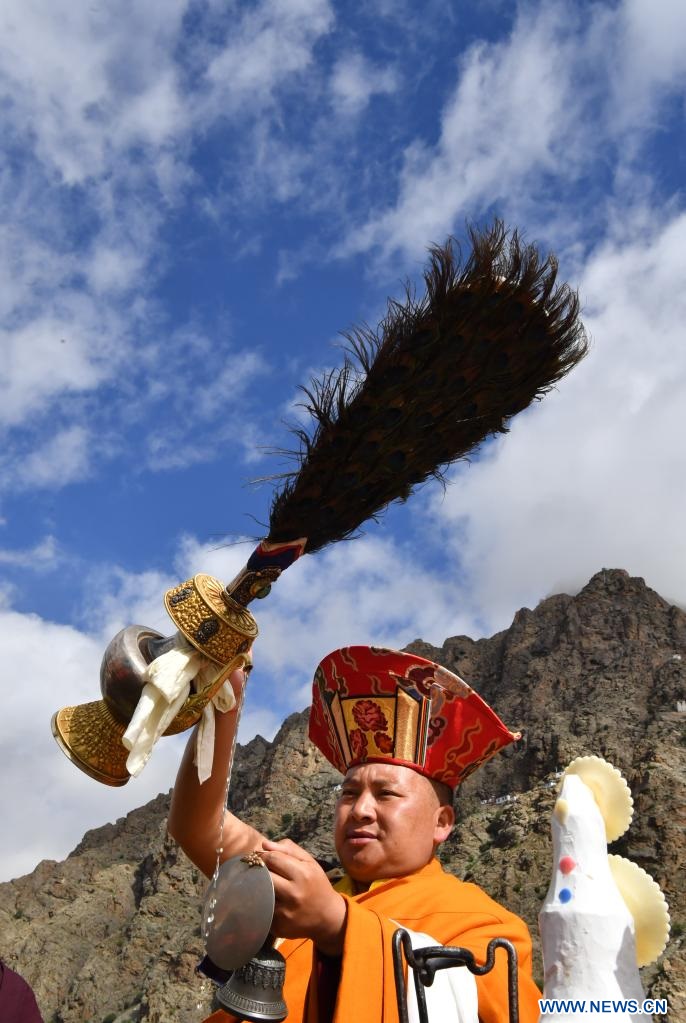 Un moine participe à un rituel annuel d'exposition de tanka de Bouddha au monastère de Tsurphu, dans la région autonome du Tibet (sud-ouest de la Chine), le 11 juin 2022. (Photo : Chogo)