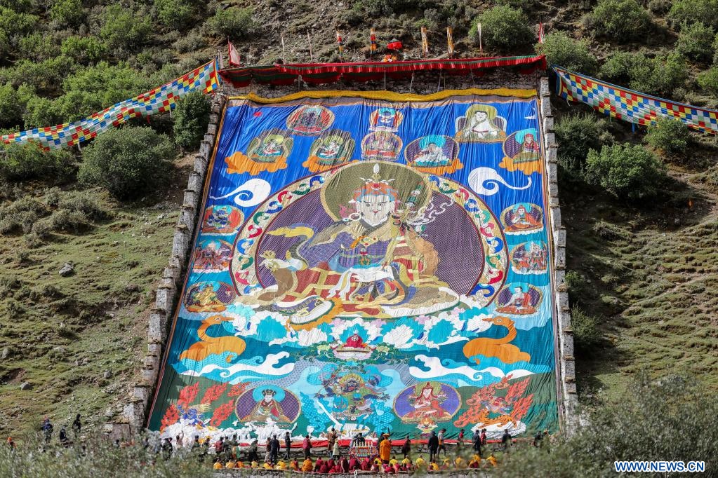 Un rituel annuel d'exposition de tanka de Bouddha au monastère de Tsurphu, dans la région autonome du Tibet (sud-ouest de la Chine), le 11 juin 2022. (Photo : Jiang Fan)