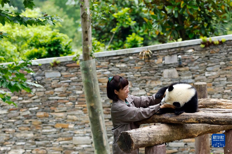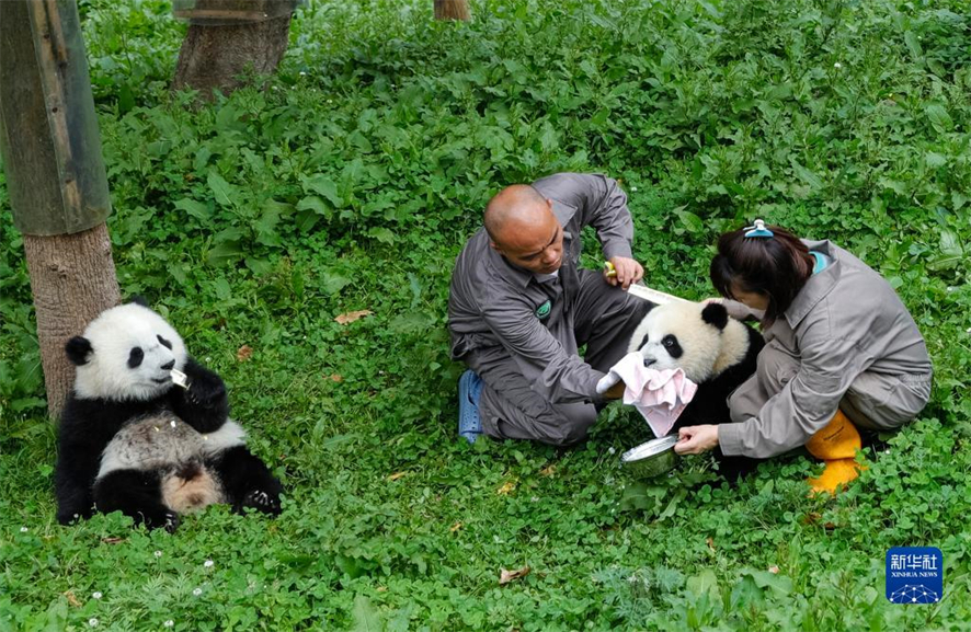 L'éleveuse Lang Shunyun et son mari Dong Chao nourrissent des bébés pandas géants avec des pousses de bambou, à la base de Shenshuping du Centre de recherche et de conservation des pandas géants de Chine, dans la province du Sichuan (sud-ouest), le 21 juin 2022. (Photo : Shen Bohan/Xinhua)