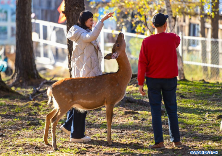 Des visiteurs s'amusent avec un cerf sika dans un parc à cerfs à Arxan de la Ligue de Hinggan, dans la région autonome de Mongolie intérieure (nord), le 20 septembre 2022. (Photo : Peng Yuan)