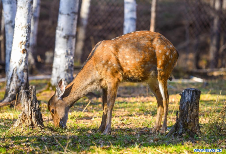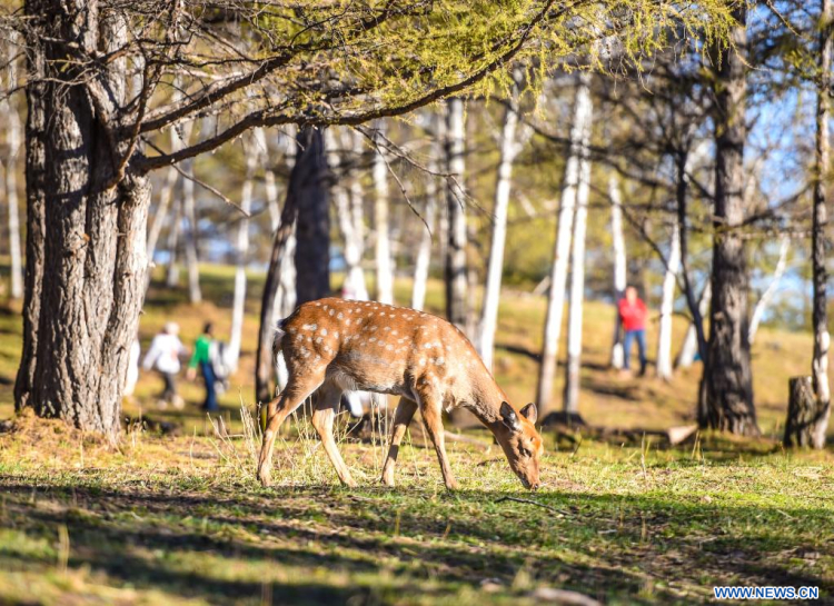 Un cerf sika se nourrit dans un parc à cerfs à Arxan de la Ligue de Hinggan, dans la région autonome de Mongolie intérieure (nord), le 20 septembre 2022. (Photo : Peng Yuan)