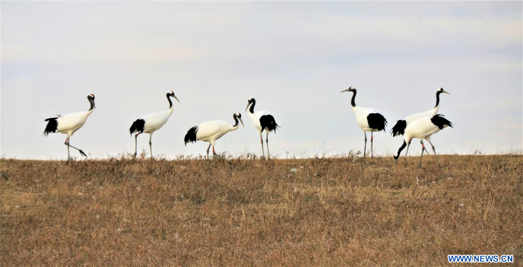 Des grues à couronne rouge dans la réserve naturelle nationale de Zhalong, dans la province chinoise du Heilongjiang (nord-est), le 21 octobre 2022. La réserve naturelle nationale de Zhalong est le plus grand habitat et la plus grande base de reproduction au monde de grues à couronne rouge sauvages. Elle est connue comme la "ville natale des grues à couronne rouge" en Chine. (Photo : Song Yanjun)