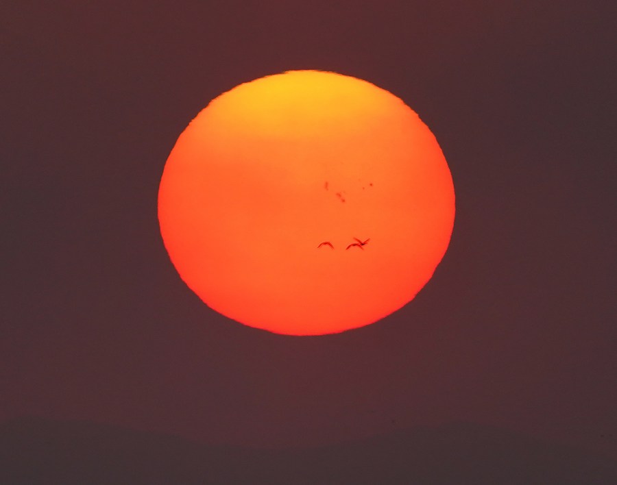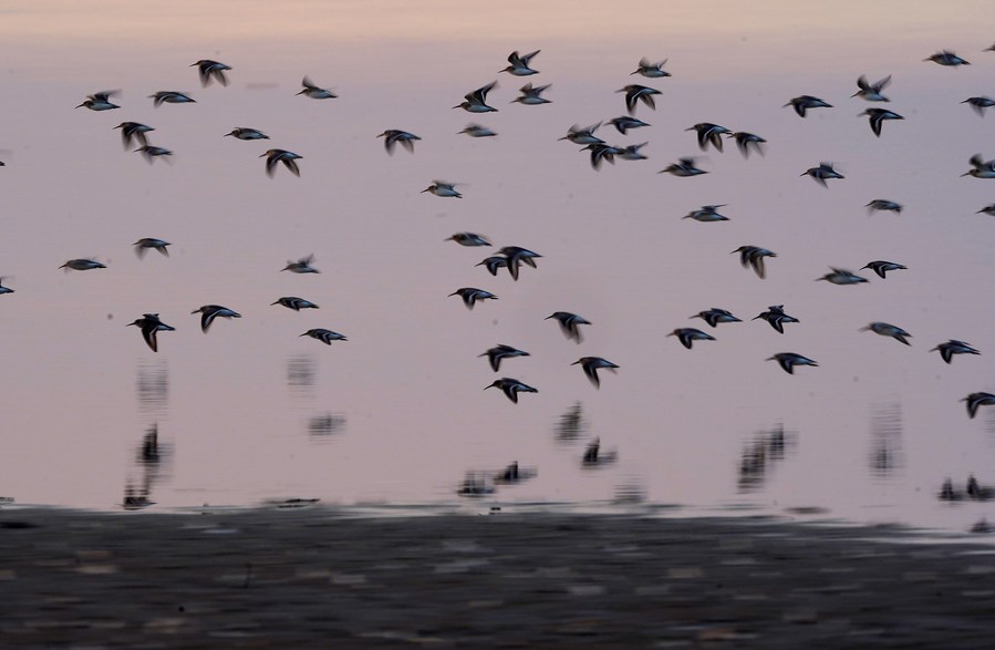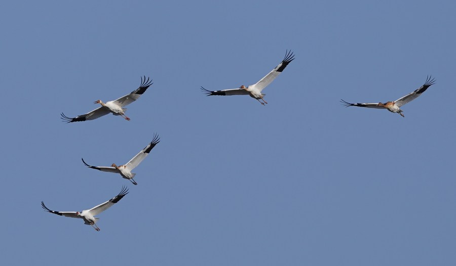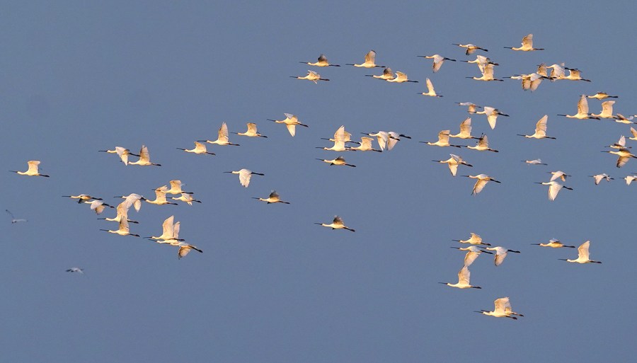 Des spatules blanches survolent la réserve nationale des zones humides Nanji du lac Poyang, dans la province chinoise du Jiangxi (est), le 11 novembre 2022. (Photo : Wan Xiang)