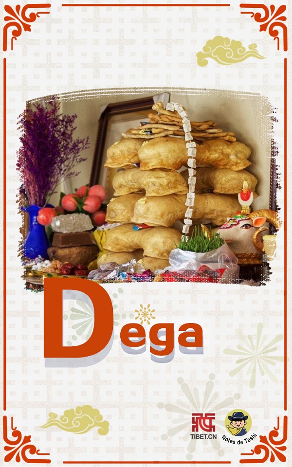 Dega est une sorte d'offrande. Fabriqués avec de la farine, les dega sont placés en couches, parmi lesquelles on met de nombreux objets en forme d'animaux, tels que des oreilles et des organes internes. Les dega au sens large comprennent également de nombreux aliments, tels que le riz bouilli aux fruits de ? renshenguo ?, qui est mouillé avec du beurre fondu. On peut non seulement l'offrir, mais aussi on le sert à chaque membre de la famille dans un bol.