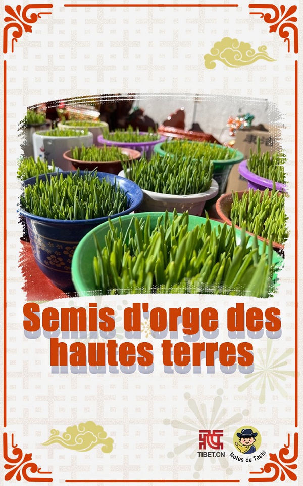 à partir de décembre dans le calendrier tibétain, chaque ménage se rendra au marché du Nouvel An pour acheter des plants d'orge. Le premier jour de la nouvelle année, on place des semis d'orge, des têtes de moutons sculptées de bon augure, des ? dega ? et d'autres objets sur l'armoire de style tibétain du salon pour célébrer le début de l'agriculture et espérer une bonne récolte pour l'année. Le placement des plants d'orge des hautes terres est également très particulier. Ils doivent être placés à c?té de la bo?te Qiema et des têtes de mouton sculptées. Cette disposition implique une bonne récolte et un démarrage en douceur pour la nouvelle année.