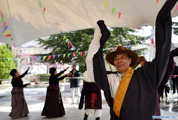 Des gens célèbrent la 15e Journée d'émancipation des serfs à Lhassa, dans la région autonome du Tibet (sud-ouest de la Chine), le 28 mars 2023. La 15e Journée d'émancipation des serfs tombe mardi. (Photo : Chogo)