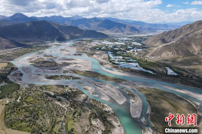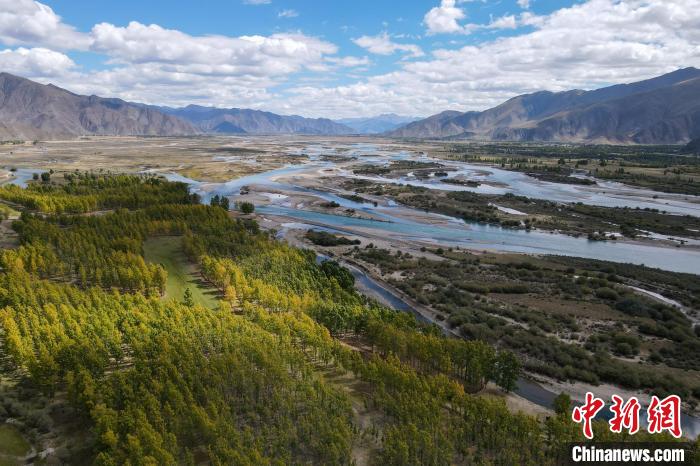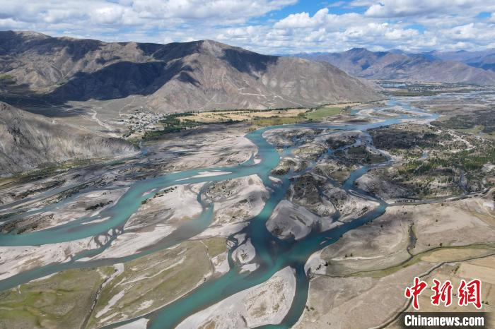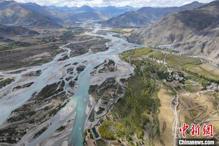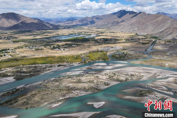 Une photographie aérienne du paysage du système d'eau de la section Dagzê de la rivière Lhassa, le 29 septembre.