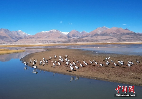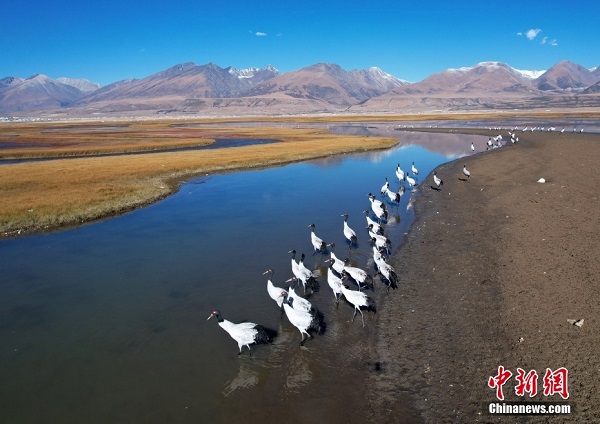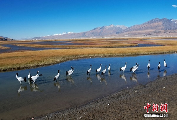 Le 23 octobre, un groupe de grues à cou noir se nourrissaient dans la zone humide d'Are, dans le district de Damxung de la ville de Lhassa. La grue à cou noir est la seule grue qui se reproduit et hiverne sur les hauts plateaux parmi les quinze espèces de grues dans le monde. C'est un animal sauvage protégé de première catégorie en Chine.