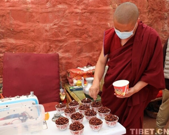 En photo : un moine du monastère de Tsande est en train de préparer du riz aux racines de potentille ansérine.