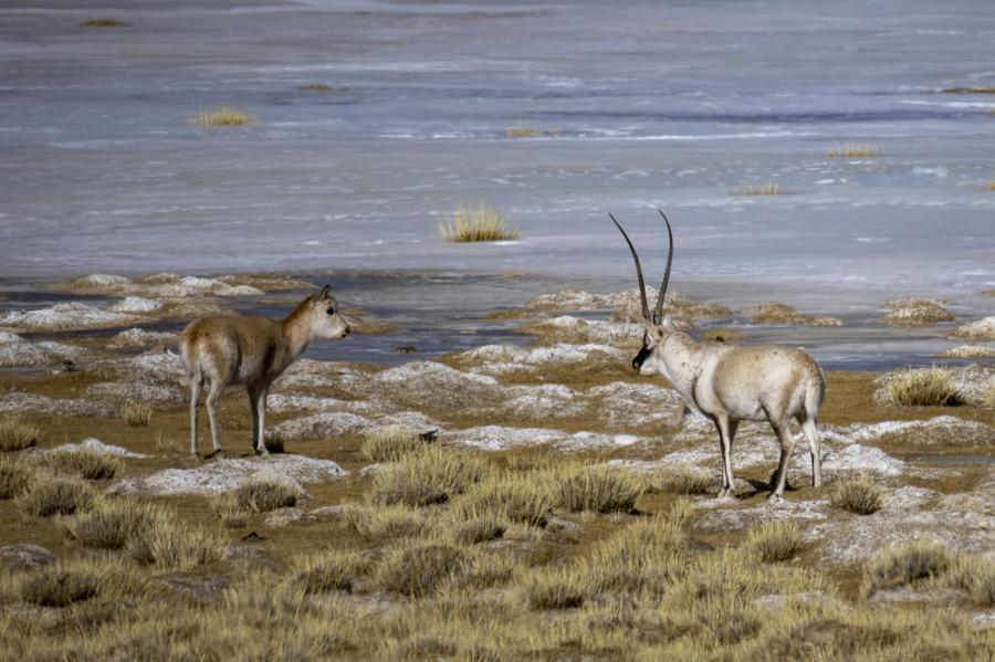 Des antilopes tibétaines vues près du lac Serling Tso, dans la région autonome du Xizang (sud-ouest de la Chine), le 5 janvier 2024. (Photo : Jiang Fan)