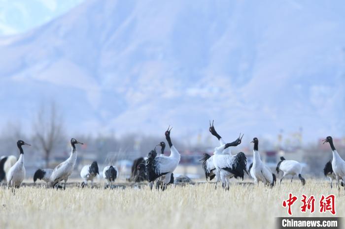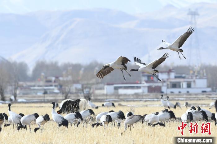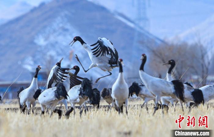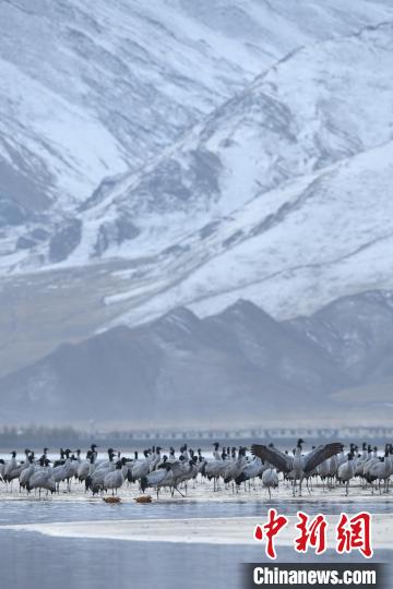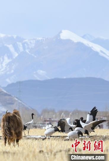 Il y a récemment une chute de neige importante dans la réserve des grues à cou noir dans le comté de Lhundrup, à Lhassa, au Xizang. Après la neige, les grues à cou noir cherchent de la nourriture et s'amusent dans les champs et les réservoirs sous les montagnes enneigées. Ces dernières années, grace aux efforts accrus de conservation de l'environnement, le nombre d'oiseaux migrateurs, notamment les grues à cou noir, qui viennent passer l'hiver dans le comté de Lhundrup, est en constante augmentation. Ces oiseaux, considérés comme des oiseaux fidèles en amour, sont une espèce protégée de première classe au niveau national en Chine. En tant qu'espèce indicatrice des changements écologiques en haute altitude, les grues à cou noir sont principalement présentes dans les prairies, les vallées et les marais situés entre 2500 et 5000 mètres d'altitude. Ces oiseaux ont même re?u un charmant nom tibétain, ? Chongchong ?. Chaque année, ils migrent de la région nord du Xizang vers les vallées du nord de Lhassa.