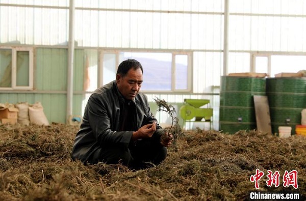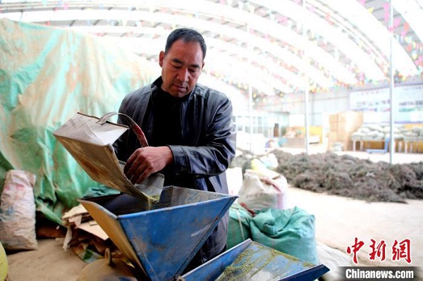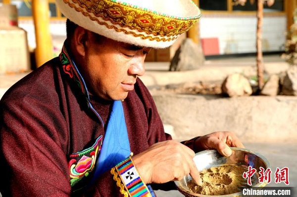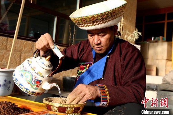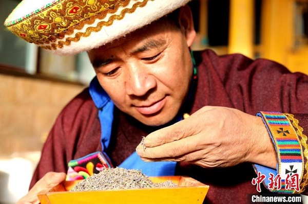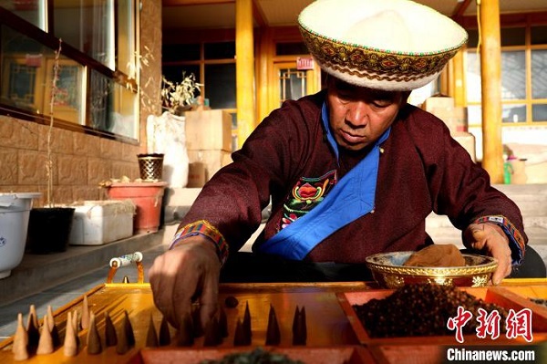 Le 17 janvier, Lin Dancheng Zhahua, héritier représentatif du patrimoine culturel immatériel provincial et résidant du canton de Songduo, comté autonome Tu de Huzhu, ville de Haidong, province du Qinghai, était en train de fabriquer de l'encens tibétain.