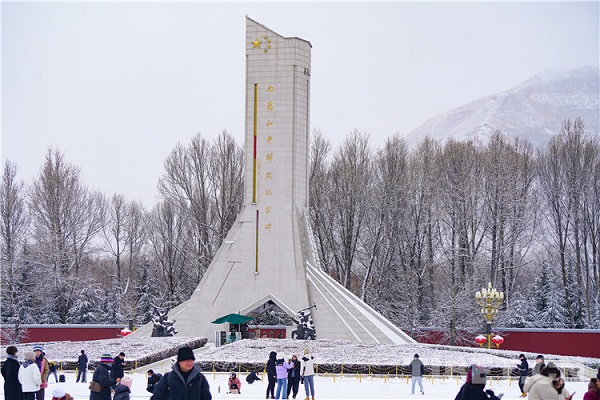 Le Monument de libération pacifique du Tibet dans la neige.