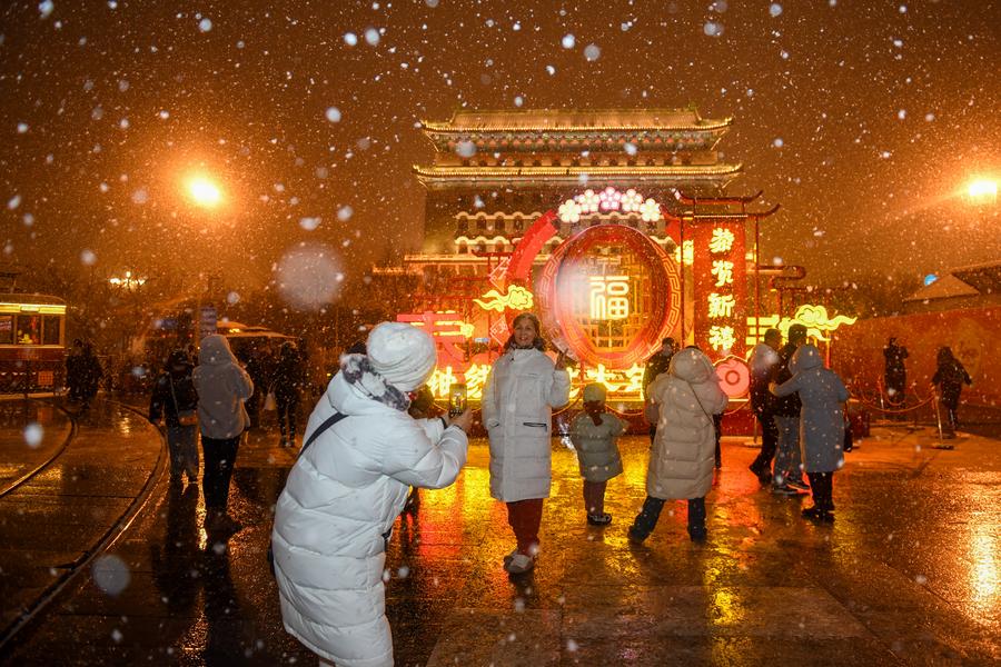 Des touristes visitent la rue Qianmen sous la neige, à Beijing, capitale chinoise, le 20 février 2024. (Photo : Ju Huanzong)