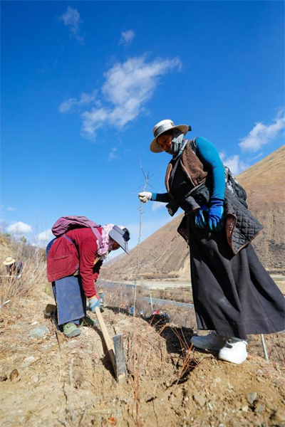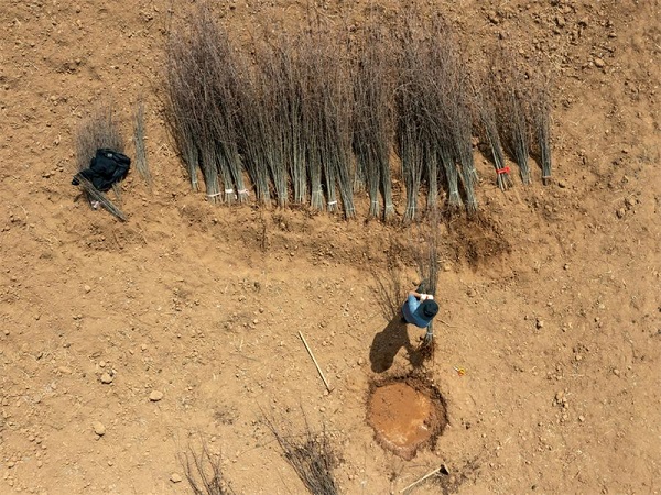 Un villageois regroupe des jeunes plants de Malus transitoria dans le comté de Daofu de la province du Sichuan (sud-ouest de la Chine), le 10 mars 2024. (Shen Bohan / Xinhua)