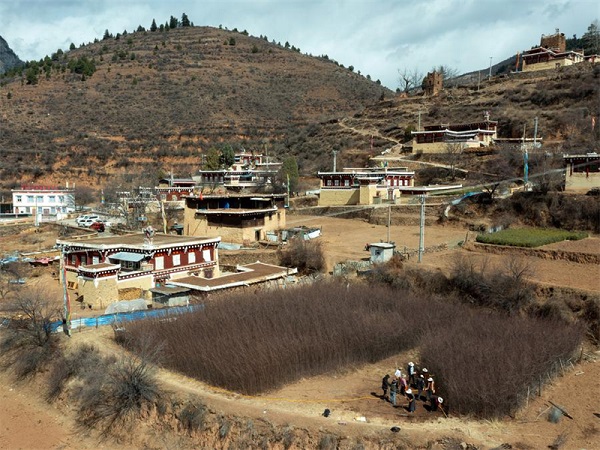 Photo prise par un drone le 10 mars 2024 montrant des villageois sélectionnant des jeunes plants de Malus transitoria dans le comté de Daofu de la province du Sichuan (sud-ouest de la Chine). (Shen Bohan / Xinhua)