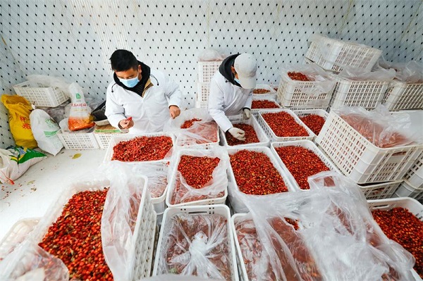 Des ouvriers sélectionnent des fruits de Malus transitoria dans un entrep?t frigorifique d'une entreprise alimentaire du comté de Daofu, dans la province du Sichuan (sud-ouest de la Chine), le 10 mars 2024. (Shen Bohan / Xinhua)