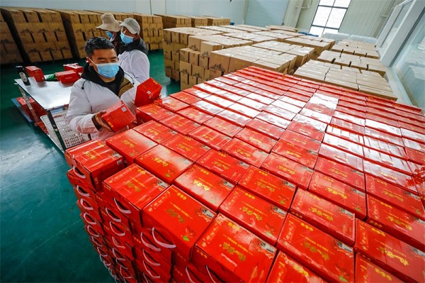 Des ouvriers préparent des boissons à base de Malus transitoria dans un atelier d'emballage d'une entreprise alimentaire du comté de Daofu, dans la province du Sichuan (sud-ouest de la Chine), le 10 mars 2024. (Shen Bohan / Xinhua)