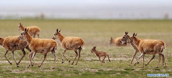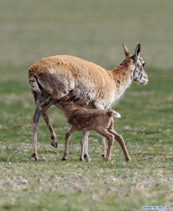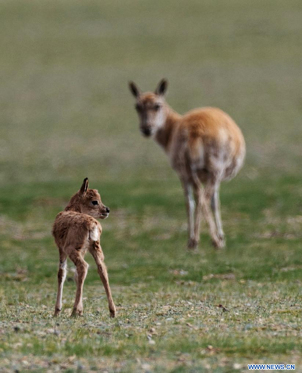Une antilope tibétaine et son petit dans la réserve naturelle nationale de Qiangtang dans la région autonome du Xizang (sud-ouest de la Chine), le 17 juin 2024. La population totale des antilopes tibétaines a dépassé les 300.000 individus, dont plus de 200.000 vivent actuellement dans la réserve naturelle nationale de Qiangtang. (Photo : Fei Maohua)