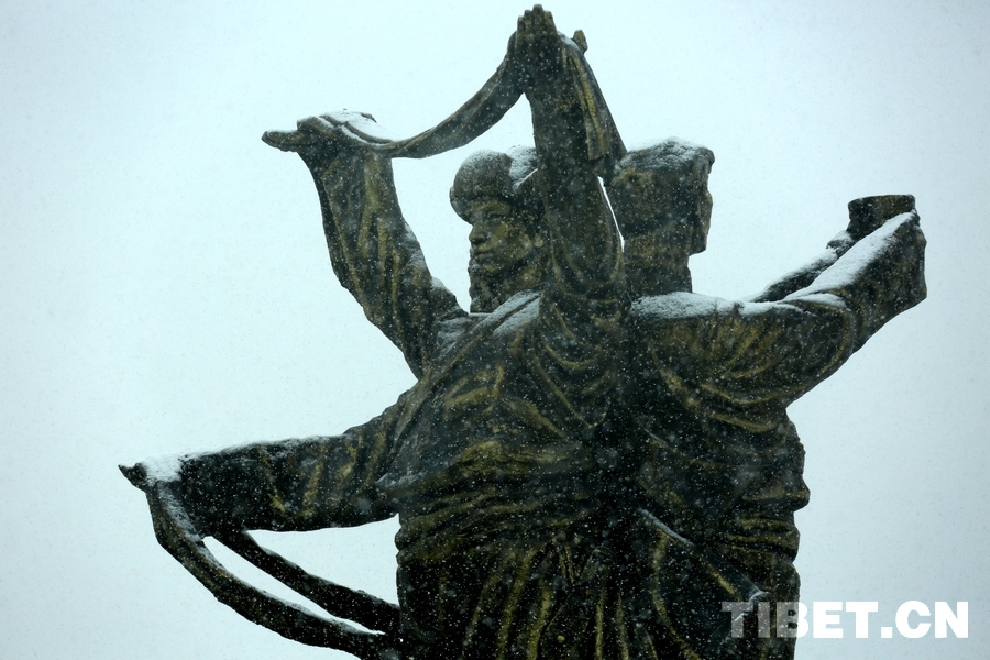 La ? neige d'automne ? qui appose une couche de ? tulle ? sur les sculptures de la place culturelle de Shangshung.
