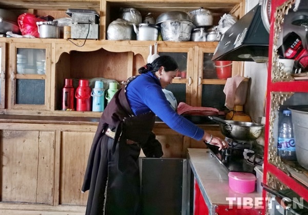 En photo : Pema Lhamo utilisant un réchaud à gaz chez elle.