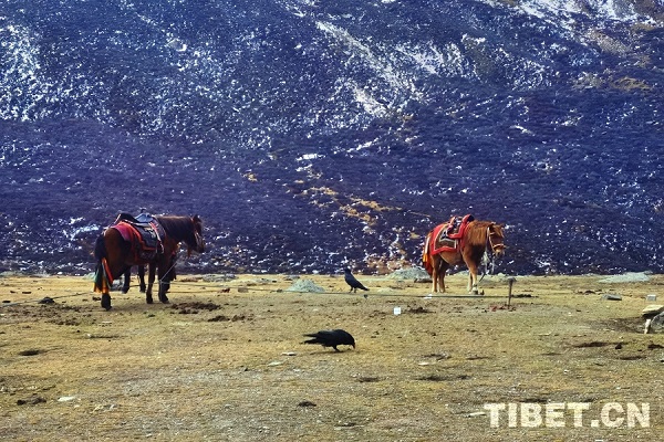 Deux chevaux et deux corbeaux profitant chacun paisiblement du lac Samutso, dans une harmonie tranquille.